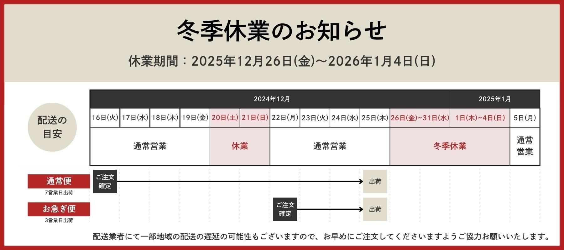 ※注文確定が完了後(銀行振込の場合はご入金確認後)からの出荷手配開始となります。